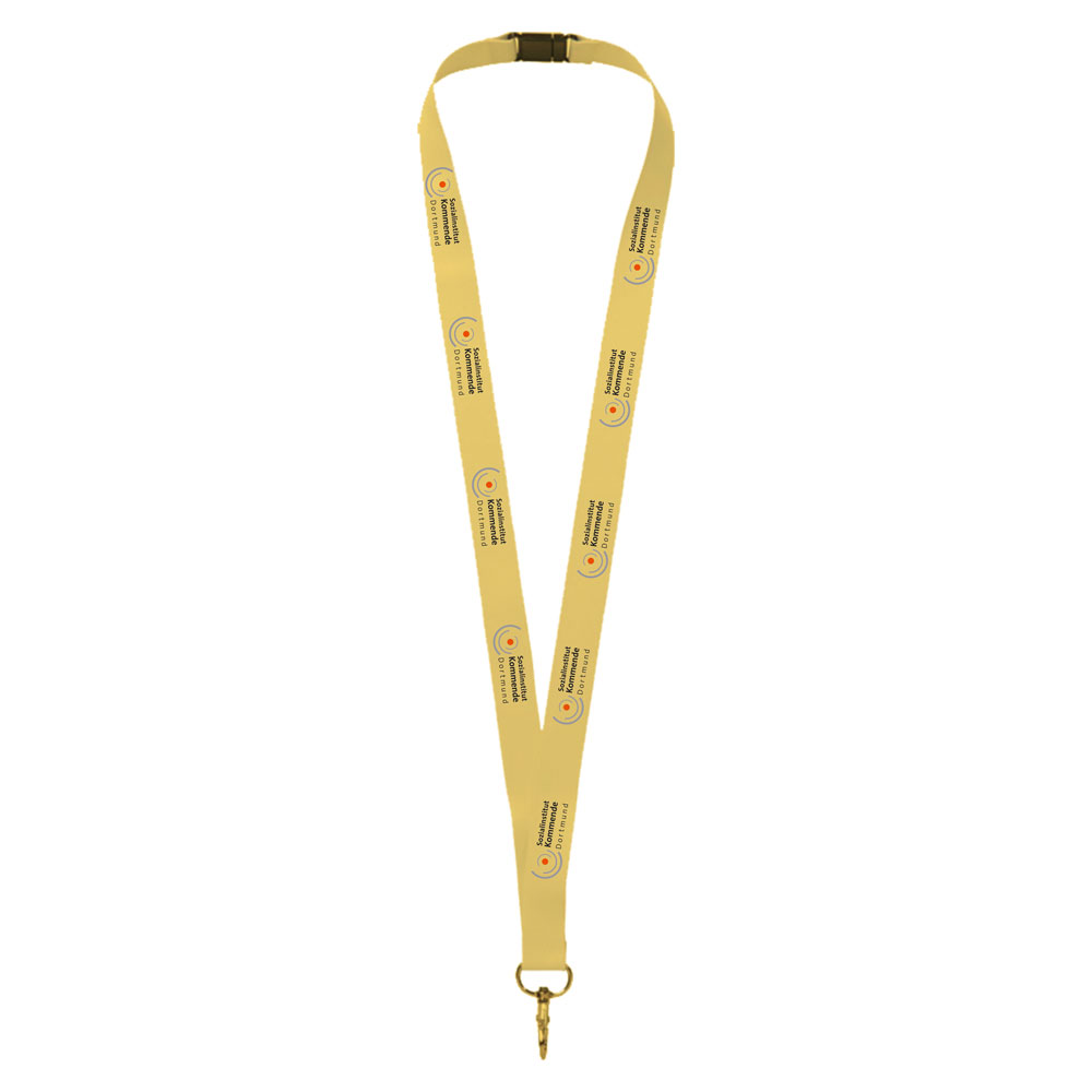 Sublimations-Schlüsselband aus recyceltem PET Kunststoff mit vollfarbigem Design, einem Metallhaken und einer recyceltem PET Sicherheitsschnalle, um Erstickungsgefahren auszuschließen. Beide Seiten vollfarbig bedruckt. Sie können ein Namensschild, einen Ausweis oder Schlüssel daran befestigen. 20mm breit - inkl. Druck 4c Druck auf dem Band Grundfarbe gelb